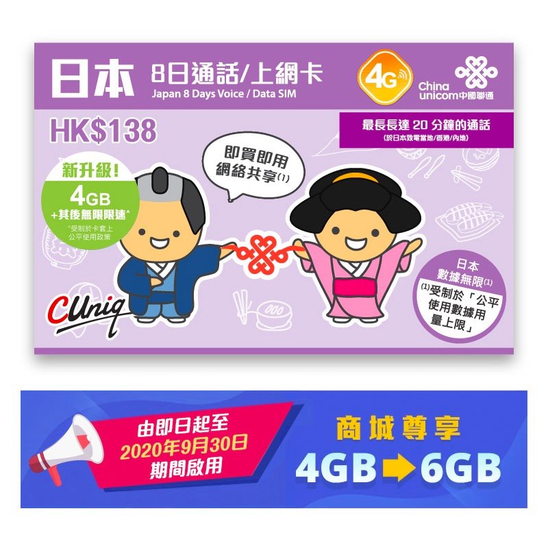 - 此卡只提供日本流動數據服務 – 4G無限數據用量(當日本總數據用量達到「公平使用數據用量上限」 4GB,客戶仍可使用流動數據服務,但其數據傳輸速度(上載及下載)將被減慢至128kbps,並且不可用於網絡分享? (tethering)及點對點傳輸(Peer-to-Peer services)。詳情請參閱中國聯通(香港)運營有限公司之公平使用政策。)